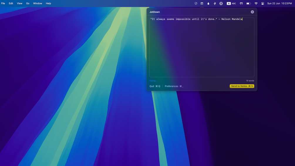 JotDown is a lightweight macOS utility that lets you quickly jot down notes to Apple Notes—straight from your menu bar. Whether you’re capturing ideas, tasks, or reminders, JotDown keeps your workflow seamless and distraction-free.
